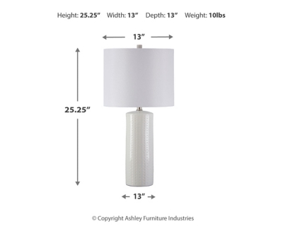 Series Features:White glazed ceramic table lamp. Drum hardback shade. 3-way switch. (1) E26 socket, type A bulb recommended - 100 watts max or 23 watts max CFL.